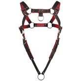 Harness your excitement in more ways than one! With this sexy, black and red, PU leather harness you can show off your body and tether the straps to your rod. Each strap is fully adjustable; use the nickel-free, metal buckles to cinch it tight. At the base of the harness is a 2 inch diameter (50mm) cock ring that serves the dual purpose of enhancing your erections and holding the harness in place. You can choose to expose your goods or cover them with a spacious, matching jock strap. The jock strap covers the front and still exposes your booty with two straps that go around the thighs and a belt that tightens around the waist. Spot clean with toy cleaner as needed and wipe with a soft cloth. Show off your body and enjoy the look and feel of this strong, faux leather harness! Put the harness over your shoulders and tighten or loosen it so that the cockring can comfortably slip over your shaft and testicles. To put the cockring on, slip one testicle in at a time, and then pull your flaccid shaft through the ring. After that is secured, you can tighten the straps to gently pull up or lift your shaft. If anyone tugs against your harness, they will also be gently tugging at your rod as well! Cover up your goods until the big reveal later by wearing the roomy jock strap around your waist and hips. Wear it at your favorite kink club, adult party, or leather festival! Measurements: Waist: 29.5 inches to 37.5 inches circumference. Chest: 36 inches to 40 inches circumference. Cock ring: 2 inches (50mm) inner diameter. Materials: PU leather, metal Color: Black, Red