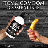 Love the texture and look of cum? Play with our Jizz Body Glide and enjoy using it in sensual play! The creamy white texture is made from a water-based mix and it is unscented so you can enjoy the look and feel without any lingering scents! It is super slippery, so you can slip and slide over each other as you massage each other's bodies. As a bonus, even if it spills it is non-staining! It stays slick, but because of the water-base it cleans up easily with soap and water. Ingredients included are generally body safe but do include glycerin, so it is not recommended for internal use. Keep away from children and keep at room temperature in an upright position. You'd both been edging all day, and even the slightest touch below made you shiver in anticipation. Feeling pent up, you bite your lip as soon as you think of sweet release. Finally, you're both home. You take the bottle and warm it up in hot water so the solution starts to get to body temperature. As you begin to touch yourself, you get closer and closer to climax. As you near the edge, you squirt the hot jizz body glide over their chest and rub it into their skin. They drop a similar load on you and you rub against each other, slipping and sliding against naked skin, your hands rubbing it everywhere as you moan. Finally, you can take it anymore and, covered in slippery, creamy white jizz, you both add your own hot juices to the mix! Measurements: 16 fl. oz. / 488 mL Ingredient List: Purified Water, Propylene Glycol, Glycerin, Hydroxyethylcellulose, Diazolidinyl Urea, Methylparaben, Propylparaben, Xanthan Gum, Titanium Dioxide (CI 77891). Color: White Note: WARNING: Should irritation occur, discontinue use immediately. Keep out of eyes and ears. Keep out of reach of children. Store at room temperature. While generally considered safe by the FDA, it is recommended that you do not consume this product. For external use. CAUTION: Very slippery, clean spills immediately. Keep bottle upright.
