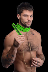 Lead your sub around and control their movement during sex with this glowing collar and leash set! Made with a sturdy white PU Leather with gold metal hardware for elegance and durability - adjustable to find the perfect fit with a generous amount of gold chain. Perfect for light bondage enthusiasts who want to add a kinky glowing twist to their nocturnal activities. Collar Measurements : 19.75 inches in length, 2 inch width, adjusts from 11.5 to 16.5 inches in circumference Leash Measurements : 36.5 inches overall length, 27.5 inch chain length Materials : PU Leather, Metal Color : White, gold, glows green Key Features Collar and leash included Adjustable collar for the perfect fit Glows in the dark Gold nickel-free metal hardware and white leather for an elegant appearance