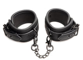 Get kinky with this Wrist and Ankle Cuff Set! The straps are fully adjustable and are padded for your comfort. Made with vegan-friendly, faux leather, the PU leather straps are comfortable and perfect for long-term wear during scenes. Each of the cuffs have a metal D-ring that the 2 metal chains attach to. All metal is nickel-free. Spot clean the set with a toy cleaner and a soft cloth. Invite your lover to try something new and present them with this ankle and cuff set! After they have gotten comfortable, lovingly guide them into a submissive position as you place the cuffs around each of their wrists and ankles. Take your time playing with binding their wrists together, their ankles together, and then switching it up so wrists are attached to ankles, and their legs open wide! Enjoy this simple and elegant set that enhances any kinky scene! Measurements: Wrist cuffs adjust from 4.75 inch to 9.75 inch circumference. Ankle cuffs adjust from 6 inch to 11.75 inch circumference. Materials: PU leather, metal Color: Black