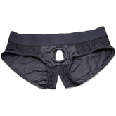 This great alternative to a strapon harness is comfy and compatible with all dildos! Play with a different dynamic with this Crotchless Panty Harness! This harness has a universal O-ring that can fit any strapon dildo. The wide, elastic waistband is comfortable and hugs you above the hips. Designed so that you can both give and receive pleasure during play, it is crotchless and has an open back that exposes your booty, too! This comfortable, easy to play in, supportive panty is made of nylon and is machine washable on a cold cycle. It can also be hand washed in mild soap and cool water. Slip these sexy panties on and then grab your chosen pegging dildo. Slip the dildo under the waistband and push it through the hole in the front. The O-ring will hold it in place and keep it from slipping it. Depending on the weight, it may need some manual support or it will pull the panties down. Grab some lube and your aroused partner and enjoy! Measurements: 19.25 inches waistband diameter, fits 39 to 44 inch waist circumference. O-ring inner diameter: 1.75 inches Materials: Spandex Color: Black
