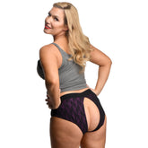 This great alternative to a strapon harness is comfy and compatible with all dildos! Play with a different dynamic with this Crotchless Panty Harness! This harness has a universal O-ring that can fit any strapon dildo. The wide, elastic waistband is comfortable and hugs you above the hips. Designed so that you can both give and receive pleasure during play, it is crotchless and has an open back that exposes your booty, too! This comfortable, easy to play in, supportive panty is made of nylon and is machine washable on a cold cycle. It can also be hand washed in mild soap and cool water. Slip these sexy panties on and then grab your chosen pegging dildo. Slip the dildo under the waistband and push it through the hole in the front. The O-ring will hold it in place and keep it from slipping it. Depending on the weight, it may need some manual support or it will pull the panties down. Grab some lube and your aroused partner and enjoy! Measurements: 18 inches unstretched waistband diameter, fits 35 to 40 inch waist circumference. O-ring inner diameter: 1.75 inches. Materials: Spandex. Color: Purple/Black.