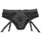 Wear these sexy undies and surprise your partner with a harness that includes both form and function! The stretchy spandex and nylon panties have a beautiful lace design that accentuates your curves and hips while still offering support for a strapon dildo. The wide strap at the hips supports the lower back and helps hold up the weight of the dildo. You can enjoy giving and receiving with this crotchless set that also includes a slit in the back for access to your derriere! At the front is an O-ring that fits most dildos and another layer right behind it to reduce chafing that the dildo base sits against. The opening to the O-ring has a 1.75 inch diameter. Enjoy wearing stockings? The garter belt straps help keep up a cute pair of stockings for those who enjoy wearing them! To clean after use, you can wash it in the machine on cold, but to keep the elasticity for longer make sure to hand wash in cold and air dry. Wear this cute pair of panties and be ready for pegging play whenever and wherever without messing with a bunch of bulky harness straps! You don't have to look like you're trying to gear up for a leather show when you want to get into some strapon fun! Simply slip these comfortable and sleek panties on and you're ready to go! Wear it under a pair of pants, leggings or even a tight fitting dress! Bring a compatible strapon dildo in your purse or bag and strap it in when it's time. The dildo slips in between the lower layer of fabric on the panties and pushes through the O-ring to be securely held in place. Enjoy having fun while looking great doing it! As a bonus, if you enjoy getting licked, played with or teased, your crotch and derriere is exposed as well! Measurements: 17.5 inches unstretched waistband diameter, fits 35 inch to 40 inch waist circumference. O-ring inner diameter is 1.75 inches. Materials: Nylon, Spandex Color: Black Note: Dildo Sold Separately. Can be machine washed on a cold setting with no bleach added. To preserve the elasticity of the material, hand wash in cold water and air dry.