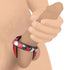 Use your favorite lube to protect yourself from friction and stroke your shaft until it*s wet and lubed. Take the straps and begin to wrap them around the base of the shaft, behind the balls. Press the metal snaps securely in place taking care not to pinch the scrotal tissue. Then, take the hanging strap and bring it between the testicles to separate them and take the loop and secure it to the main cock-ring strap again. Enjoy the pressure building in your balls and the large, hard rod you're showing off! It looks sexy and feels great! After use, simply wipe clean with a toy cleaner and a soft cloth.