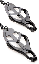 Add some style to your BDSM play with these Black Japanese Clover Clamps! Made to grip on the nipples with pressure being applied when chain is pulled. Just imagine your bad little subs nipples being squeezed and pulled!