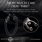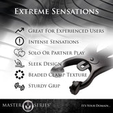 A timeless classic. The Monarch Nipple Vice provides a light initial sensation...until the chain is pulled. They become increasingly harsh as more tension is added to the chain. The clover-style mechanism gives the Monarch a tight and unyielding grip on sensitive flesh. Ideal for solo play or with the one you want to dominate.
