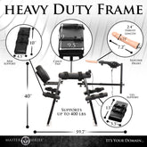 Transform an innocent looking body-work table, give it an upgrade, and add a detachable and adjustable sex machine and what do you get? The Obedience Bench and Sex Machine combo of your dreams! Enjoy the plush padding of this sturdy, durable and sexy table in almost any pose! The arm pads, leg pads and facerest are all adjustable so you can lower, lift and tilt them for any position, height or body size! The versatility of this bench pairs perfectly with the sex machine that attaches right onto the frame, has a thick silicone dildo ready to use, and a corded remote that your or your partner can control!         That's right, this can be a solo or partnered ride! With a weight capacity of 400 lbs, this heavy-duty steel covered in plush, padded, vegan leather cushions in sleek black provides comfort for long duration scenes! Adjust the height of the arms and legs for a customized piece of sex furniture that allows you to plunge deeper than ever before and hit the right spot every time. You can even remove the headrest, which is U-shaped so that, when it's on, you can still hear every gasp and scream of pleasure. With straps that buckle on with quick-release connectors along the legs, torso and warms, you can enjoy restraining your submissive while they get forced into extreme levels of pleasure! Use it on yourself by strapping yourself in, instead! The remote control has a variable speed dial so you can choose the intensity and enjoy up to 195 RPMs of thrusting from this premium silicone dildo!         You aren't limited to keeping the sex machine connected at the base, either! Have your partner remove it and they can manually operate the angle on and off the bench! Enjoy playing with different positions and use either the bench or the sex machine separately to your heart's desire! The bench is primarily designed for facedown positions, but you can explore different ways to perch on it and decide how to best enjoy it! But when you're facedown, your face is just exposed enough through the facerest that you can give your partner oral while you receive a powerful pounding from behind! Test your limits and enjoy!         Imagine being strapped in, facedown on the bench. Your limbs can't move and your face is buried in the facerest so you can't see what happens next.Your partner has you strapped in tight and then you hear the machine turn on. They rub lube on your exposed entry and then angle the machine just right. Your heart races. You're not ready yet, so they warm you up with spankings and floggings, then they let the tip touch your entry and suddenly you're being pounded! You shriek in shock and then soon the scream turns to a moan as you feel yourself opening up, taking it in, and enjoying the ride!         To clean the bench after use, spray with a toy cleaner and use a soft cloth to wipe it clean. Avoid exposure to sunlight and heat to preserve the vegan leather material longer. Wash the dildo with warm water and mild soap, spray with a toy cleaner and then rinse and let air dry.             Measurements   :     Overall: 59.7 inches Length x 28.7 inches Width x 40 inches Height.    Torso pad: 19 inches x 9.5 inches.    Arm pads: 10 inches x 4.5 inches.    Leg pads: 13 inches x 5.5 inches.    Dildo: 7.2 inches insertable, 1.75 inches widest diameter, 2.4 inches thrust length.            Weight Limit   : Bench supports up to 400lbs (181.4kg)            Materials   :     Bench: Vegan leather, iron, nylon, ABS plastic    Dildo: Silicone             RPM   : Dildo thrusts up to 195 times per minute.             Voltage   : 24 Volts             Color   : Black             Note   : Use only with water-based lubricants.