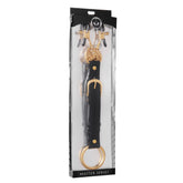 Apprehend them with this golden nipple clamp and cock ring set. Two alligator style nipple clamps with an attached chain form a devious Y shape that attaches to a 1.75 inch metal cock ring supported by a PU leather belt strip. The nipple clamps feature an adjustable pressure screw, while the cock ring assists in maintaining his erections. With each movement, the chains will pull on the clamps, sending stimulating pressure to his sensitive nipples. The PU leather belt is adjustable so you can restrict or increase the distance from the clamps to the cock ring. Measurements: 24.5 inches in total length, nipple chain measures 6 inches in length, cock ring measures 1.75 inches in diameter. Material: Metal, PU leather, vinyl. Color: Gold