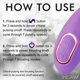 It's time to indulge in toys that truly give you pleasure! This Pro-Thrust Max Thrusting and Pulsing Rabbit vibe has some extra sexy features that will get your juices flowing! The thick shaft has a smooth, round head so it can easily slide in with the help of some lube. Beneath the head are subtle little ridges that add extra stimulation. The shaft itself has a sexy secret; with the press of a button it thrusts inside of you, and you don't have to do a thing or move a muscle to enjoy it! Pick between 7 different thrusting modes and get the bonus feature of it automatically heating up inside of you! This hot rod will radiate its heat into your muscles and keep you open and wet! At the same time you can enjoy the 7 different pulsing sensations from the arm of the rabbit and enjoy that stimulating right against your clit! Combining both internal and external stimulation is the number one way to push you over the edge of pleasure. Make sure to lay down a towel! After you're done with your sel-flove session, wash it with warm water and mild soap, then spray it with a toy cleaner. This toy is even good in the shower or tub, too! It's rated IPX7 so it can handle showers or being submerged underwater for up to 30 minutes! Recharge using the magnetic USB charger included. Due to it being made out of silky, smooth, premium silicone, this toy is phthalate-free and body-safe but must only be used with water-based lubricants.