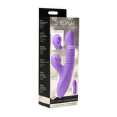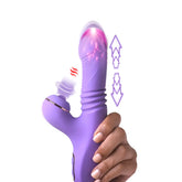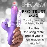 It's time to indulge in toys that truly give you pleasure! This Pro-Thrust Max Thrusting and Pulsing Rabbit vibe has some extra sexy features that will get your juices flowing! The thick shaft has a smooth, round head so it can easily slide in with the help of some lube. Beneath the head are subtle little ridges that add extra stimulation. The shaft itself has a sexy secret; with the press of a button it thrusts inside of you, and you don't have to do a thing or move a muscle to enjoy it! Pick between 7 different thrusting modes and get the bonus feature of it automatically heating up inside of you! This hot rod will radiate its heat into your muscles and keep you open and wet! At the same time you can enjoy the 7 different pulsing sensations from the arm of the rabbit and enjoy that stimulating right against your clit! Combining both internal and external stimulation is the number one way to push you over the edge of pleasure. Make sure to lay down a towel! After you're done with your sel-flove session, wash it with warm water and mild soap, then spray it with a toy cleaner. This toy is even good in the shower or tub, too! It's rated IPX7 so it can handle showers or being submerged underwater for up to 30 minutes! Recharge using the magnetic USB charger included. Due to it being made out of silky, smooth, premium silicone, this toy is phthalate-free and body-safe but must only be used with water-based lubricants. You lean back against the shower wall, angling the toy upward between your thighs. You're already wet and looking forward to easing this aching tension you've held onto all day. As you slide it in you feel yourself stretching. Then, as you turn on the thrusting, the shaft heats and you feel your muscles relaxing and opening up. The pulsing against your clit is beginning to make you moan out loud! You writhe your hips, grinding against it and then you feel the pressure and pleasure build! As the ecstasy rises, your knees buckle as you nearly collapse at the peak of your pleasure! You rinse off the toy and wait for your heart to stop racing before seeing if you can ride this wave again! Measurements : Overall length: 8.4 inches - 9 inches (fully extended). Insertable length: 4.4 inches - 5 inches (fully extended). Widest insertable diameter: 1.45 inches. Thrust length: 0.6 inches. Materials : Silicone, ABS plastic Color : Purple