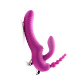 Ergonomically designed for the female body, this strapless strap-on provides clitoral, vaginal, and anal pleasure to the wearer while delivering a textured shaft with which to penetrate their partner. Furthermore, this remarkable couples toy thrums throughout all stimulation points with the power of two vibrating bullets. The bottom will appreciate a rippled, slightly curved shaft, perfect for stimulating the G-spot or P-spot. Meanwhile, the clitoral pad has two ridges that provide immense pleasure to the top with every thrust. A smooth penetrator is curved to directly target their G-spot, as well. Finally, the beaded anal stimulator provides a thrill of ecstasy as the seamless bulbs hum delightfully. This all-inclusive tool is waterproof, for enjoyment in all settings and an easy clean with mild soap and water. Made of premium silicone, it is non-porous, phthalate-free, and not compatible with silicone lubricants. Measurements: 9 inches in total length. Shaft is 6 inches insertable for the bottom, 1.5 inches in diameter. Vaginal penetrator for the top is 4 inches in length, 1.25 inches in diameter. Anal penetrator is 3 inches in length, .75 inches in diameter. Material: Silicone, ABS plastic. Color: Purple. Note: Requires 6-LR44 batteries, included.
