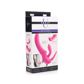 Ergonomically designed for the female body, this strapless strap-on provides clitoral, vaginal, and anal pleasure to the wearer while delivering a textured shaft with which to penetrate their partner. Furthermore, this remarkable couples toy thrums throughout all stimulation points with the power of two vibrating bullets. The bottom will appreciate a rippled, slightly curved shaft, perfect for stimulating the G-spot or P-spot. Meanwhile, the clitoral pad has two ridges that provide immense pleasure to the top with every thrust. A smooth penetrator is curved to directly target their G-spot, as well. Finally, the beaded anal stimulator provides a thrill of ecstasy as the seamless bulbs hum delightfully. This all-inclusive tool is waterproof, for enjoyment in all settings and an easy clean with mild soap and water. Made of premium silicone, it is non-porous, phthalate-free, and not compatible with silicone lubricants.