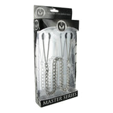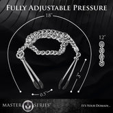 These sexy tweezer nipple clamps are designed to exert either light or strong pressure with a simple sliding clamp. Vinyl coated ends attached to a linked chain. Your plaything will love the variation between light and intense pressure, and the chain serves as a visual adornment for a sensual look. Measurements: 18 inches in total length, each clamp measures 3 inches in length. Material: Steel and vinyl. Color: Silver