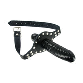 The Ride Me Mouth Gag keeps you stuffed and your partner silent There is plenty of penetration to go around with a glossy black dildo on the outside, and a cock-shaped mouth gag on the inside. This double dose of dick is supported by a heavy-duty adjustable leather strap that buckles behind the head, and a studded mouth-guard. Fill up their mouth and then climb on and ride Measurements: Neck strap adjusts from 15.5 to 21.2 inches around, Dildo has 4.75 inch insertable length, 1.55 inch max diameter, Gag has 2.5 inch insertable length, 1.5 inch max diameter, Material: Leather, Metal, PVC, Color: Black