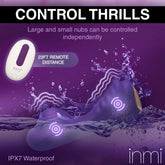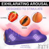 Slip this textured, premium silicone toy between your thighs and get ready for a satisfying ride! Made out of silky smooth silicone, it is phthalate-free and body-safe. Use it with lots of water-based lubricant and enjoy grinding, writhing, rubbing and humping your most sensitive parts against the grooved ribs of the front motors or the cone shaped, circular rows of tantalizing pleasure for your backdoor entry. Enjoy 3 speeds and 7 patterns of powerful vibration from dual motors that you can enjoy independently or together! Control it using the battery-operated remote control and ride hands-free! This small but mighty vibrator is the perfect companion for any solo session and is ergonomically designed to be comfortably used in nearly any position! Get creative and explore your body with liberated sel-flove from INMI! After use, wash with warm water and mild soap, then spray with a toy cleaner and let dry. Recharge using the USB cable provided. Turn it on and pair it with the remote. Once you have the remote, try out the buzzing vibrations and touch it with your palm to feel the difference in each setting. Then grab your lube and rub it over the ribs of the toy. Slide it between your thighs, poised over it so you can hump, writhe and grind freely. If it sits too low to be comfortable, slide a pillow or wedge under your bottom and beneath the toy to keep it in place. You can also sit in a chair and slip it between your thighs. Once you find your favorite setting, let your hands wander feely and stimulate your nipples, breasts, grab your thighs and even slip your fingers inside yourself before tasting them on your lips and tongue! You'll be crying out for more in no time! Measurements : Overall length: 6.6 inches. Nubs are 1.9 inches and 2.5 inches in height. Materials : Silicone, ABS plastic Color : Purple Note : Remote distance up to 23 ft, requires 1xCR2032 battery (included).