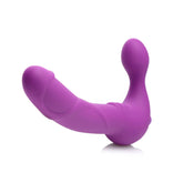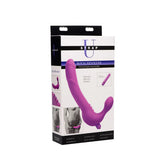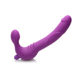 This silicone strapless strap on brings pleasure to both you and your partner Whether you are using it for pegging or sex between two females, this carefully designed dildo will enhance the experience with the exciting shape and powerful vibration. The bulb allows you to experience vaginal penetration while your clit rubs sensually against the three ridges of the clitoral pad. The long shaft has comfortable girth with a raised design to massage your partners orifice. The prominent head and slight curve are ideal for G-spot or P-spot stimulation. An extra long vibrating bullet will send buzzing bliss into both partners for greater satisfaction. This bullet can also be removed to tantalize on its own. Made of premium silicone, this double dildo is non-porous and phthalate-free. Avoid use with silicone lubricant and clean with mild soap and warm water. Measurements: 9.75 inches in total length. Up to 7 inches insertable shaft length, 1.5 inches in shaft diameter. 3 inches insertable bulb length, 1.5 inches in bulb diameter. Material: Silicone, ABs plastic. Color: Purple. Note: Requires 1-AAA battery, not included.