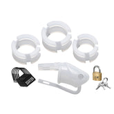Sexual denial has never been this comfortably restrictive. Flexible and lightweight, the Sado Chamber Chastity Cage is designed for long term wear. This intriguing confinement piece will hold them in submission for extended periods, while remaining undetected under clothing. The cage and rings are made entirely of premium silicone. Choose one of the 3 provided rings, place it behind the cock and balls, then slide the cage over the penis. Slide the straps of the tie down straps through the cage. Lock them up using either the included padlock of individually numbered temporary locks. The cage of the piece is outfitted with ventilation holes, allowing the wearer to wash without removal. The Sado Chamber comes complete with a silicone cock cage, three sized rings, two tie down straps, a padlock with two keys, and five individually numbered plastic locks. Measurements: Rings: 1.5, 1.75, and 2 inches in diameter; Cage: 4.35 inches in length, 1.25 inches in diameter. Material: Silicone, plastic, metal. Color: Clear. Note: Contains cage, 3 rings, 2 plastic bands, lock and keys, and 5 plastic numbered locks