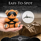 This little bondage bear just loves shi-bear-i! All tied up with silky rope and blindfolded, it's the perfect companion for your office desk, backpack, bag, purse or keychain! Give it as a gift to your friends or keep it for yourself. It's the cutest way to flag your kinky side! Fits in the palm of your hand. This kinky bondage bear is sure to put a smile on your face! Made out of polyester, PU faux leather, plastic and nickel-free metal. Measurements: Overall: 3.9 inches Long x 3.6 inches Wide x 2 inches Deep Materials: Polyester, PU leather, ABS plastic, metal Color: Brown