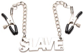 Make sure everyone knows their place when they wear these nipple clamps. The large, bold font spells out SLAVE and with a tug against the clamps you can put them in their place if they forget! The nickel free metal is perfect for sensitive skin and the shining metal looks great as a kinky accessory!