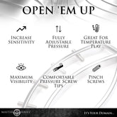 Spread her lips wide with this Spread 'Em Poker Labia Clamp! The clamps are made of durable,nickel-free, stainless steel. Feel free to use any lubricant with them and to cleanse them with boiling waterand cleaning solutions between uses without harming the device. At the top and bottom are twocompression screws that you can twist to close the clamps against the labia and cause the vulva to be ondisplay. Along each side of the clamps are rows of 4 pinch screws -also known as pressure screws- thatpoke into the tender tissue of the labia. Use the allen wrench included to adjust the pinch screws untilthey are in the right place. Make adjustments to the pinch screws before clamping down; if the labia arealready securely clamped the pinch screws will have enough pressure that each twist can potentiallydamage the tissue and nerves, so adjusting them beforehand keeps those nerves healthy so your bottomcan enjoy the full extent of feeling every time you play!
