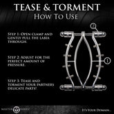 After taking a freshly cleaned clamp, take a wet towel, cloth, or wipe to her vulva as well to start fresh andclean on both ends. Put on some latex or nitrile gloves to add to the scene and give your fingers a littlemore grip as you gently rub her clitoris and stroke her labia. Once she's warmed up, open the clamp andplace it against her vulva; take a good look and see how her labia will fit into the clamps. Take the clampand begin to open the sides by screwing the compression screws open, holding the round ball at the topand the bottom until they are evenly open. With the pinch screws all the way out so their base is flat andnot pointing or poking in, begin to place one lip into the clamp and slowly compress the clamp on that lipand then the other. Start placing with her opening and tugging gently on the clamp to see if it stays inplace. The spikes and screws help keep her from closing her legs so her vulva is on full display for you!After you've played a bit, remove the clamps by loosening the screws, then start to use the allen wrenchfor round two and turn the pinch screws so they poke into the space between the clamps. This time asyou place the clamps on her labia, she will feel the poking, pinching, biting pressure from the pinchscrews and the sensations will be enhanced tenfold!