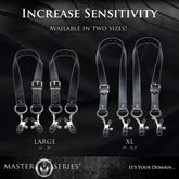 Turn up the intensity of your kinkiest scenes with these unique straps, designed to wrap around your thighs, clamp onto your labia, and spread them open! Perfect for humiliation play, gynecological roleplay, or whatever wicked fantasies you want to bring to life, this unique set keeps your partners genitals ultra sensitive and helplessly exposed like never before. The straps are lined on the interior with a velvety softness and have buckles to adjust the fit around your thighs. The rubber-tipped clamps have thumb screws that adjust their pressure. Get creative with your BDSM scenarios!