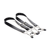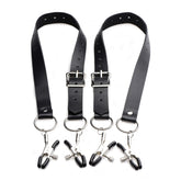 Turn up the intensity of your kinkiest scenes with these unique straps, designed to wrap around your thighs, clamp onto your labia, and spread them open Perfect for humiliation play, gynecological roleplay, or whatever wicked fantasies you want to bring to life, this unique set keeps your partners genitals ultra sensitive and helplessly exposed like never before. The straps are lined on the interior with a velvety softness and have buckles to adjust the fit around your thighs. The rubber-tipped clamps have thumb screws that adjust their pressure. Get creative with your BDSM scenarios Measurements: Adjusts from 16 to 28 inches between the tip of each clamp. Material: PU leather, metal. Color: Black.