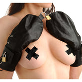 These mittens are the perfect solution for keeping their busy hands out of the way. Made from garment leather, these mittens measure 13 inches long, 5 inches wide with locking cuffs. Both mittens have an attached D-Ring for added security as it allows you to lock the mittens to each other or another object. Measurements: 13 inches long, 5 inches wide, Material: Leather, Metal, Color: Black, Note: Locks not included