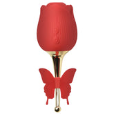 This fluttering butterfly, golden rod, and red rose are both pleasing to the eye as well as your vulva! The plush red petals of the rose are made of plush, premium, phthalate-free silicone and have a small, round hole that gently sucks at the clitoris using air-stim technology. Enjoy 10 different suction modes to tease and tantalize your little pearl. The stem of the rose is a golden rod with a round, beaded tip in the shape of a ball. Delight in an extra 10 vibration modes to enhance your pleasure as they rumble down the shaft of the stem and directly into the rod. The design of the stem allows you to pinpoint your pleasure points with targeted vibration for personalized satisfaction. With the combination of suction and vibration, enjoy the added benefit of a beautiful, silicone butterfly! The wings flutter with the vibrating rod to add extra sensation for sensitive erogenous spots along the vulva. Add your favorite water-based lubricant for best results and to keep the silicone from degrading. Enjoy this toy in the shower, too! It is IPX6 waterproof rated. After play, wash with warm water and mild soap, then spray with a toy cleaner and wipe dry. Recharge using the USB cable provided. This sexy rose is the perfect everblooming pleasure toy for every babe! Angle the rose so the air-stim hole is directly placed on or around your clitoris and then play with the settings to find the perfect level of intensity! Pull the toy away and then bring it close again, letting the rose suck up your little pearl and capture it in a flowering play of pleasure and sensation! Get the right spot by turning the rose around and placing the pinpoint end of the stem directly on your clitoris for even deeper and more intense pleasure! Measurements: Overall length: 5.8 inches, Pinpoint vibrator length: 3 inches, Air-stim opening diameter: 0.5 inches Materials: Silicone, ABS plastic Color: Red Note: Waterproof rating of IPX6; can be taken in the shower but not submerged in water. Use only water-based lubricants for best results.